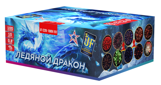 Веерная салютная установка «Ледяной дракон» подарит настоящую полярную сказку! Только ночное небо украсит не северное сияние, а невероятная батарея салюта. Сказочный зверь своими залпами раскрасит небо разнообразными мерцающими звездами и кометой, блестящими ивами и пальмами, тысячью хризантем. Зрителей ждет яркое зрелище, которое будет греметь и трещать 95 секунд. Установка запустит 100 зарядов. Так как батарея — это веерная установка, то заряды будут запускаться не по одной прямой, а под разными углами. Пиротехническое шоу занимает большую площадь для обзора. Сказочная картина из фейерверков развернется на высоте 20 м. У салюта 10 эффектов: 1. Белое мерцание с красными звёздами. 2. Зелёное мерцание с фиолетовыми звёздами. 3. Золотая ива с синими звёздами. 4. Золотая ива с золотым мерцанием. 5. Красная пальма с треском. 6. Зелёная пальма с треском. 7. Трещащая ива. 8. Синие звёзды с золотым мерцанием. 9. Серебряная вертящаяся комета с красным мерцанием. 10. 1000 трещащих хризантем с красными и зелёными звёздами.