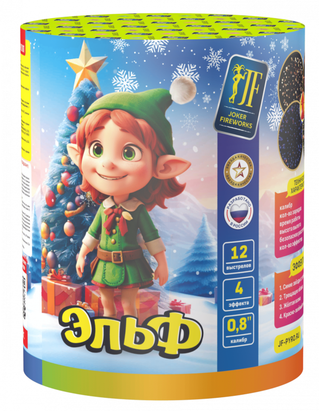 У салюта 4 эффекта: 1. Синие звёзды с зелёным мерцанием. 2. Трещащее облако. 3. Жёлтая волна. 4. Красно-зелёный пион.