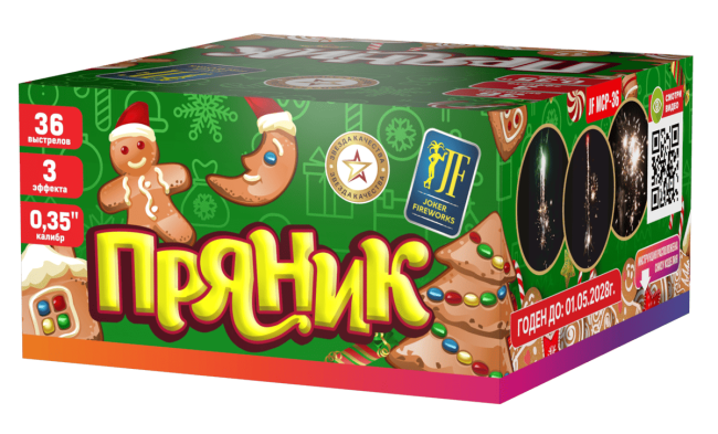 С пластиковым модульным салютом «Пряник» от Joker Fireworks легко почувствовать себя ребенком. Ведь фейерверки открывают внутреннего маленького человечка, который готов удивляться и восхищаться каждому новому залпу: * яркому, как вспышка фотоаппарата; * громкому и взрывному, словно разряд грома; * удивительному и неожиданному, как приятный сюрприз. Салют содержит в себе 36 мелкокалиберных снарядов, в 0,35 дм. Поэтому огненное шоу развернется на высоте до 10 м. Установка модульная. Зрителей ждет органичное, динамичное и «ритмичное» фаер-шоу. Длительностью от 25 до 55 сек. Интенсивность салюта высокая. Фейерверки «фонтанируют» и вылетают быстро и четко, один за другим. С салютом «Пряник» даже самый отъявленный «Бармалей» скажет: Пряник яркий и трещащий, удивительно блестящий. Приходите, запустите. И нисколько не грустите! Потому что Joker FIREWORK любит радовать гостей. Любит, любит, любит, любит, любит радовать гостей! У салюта 3 эффекта: 1. Трещащая мина. 2. Красная звезда с пышной кометой. 3. Зелёная звезда с пышной кометой.