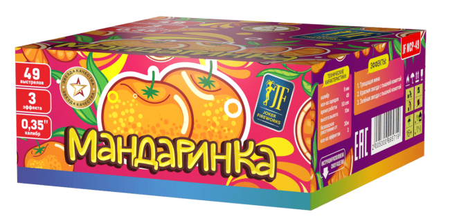 Салютная установка "Мандаринка" С чем у вас ассоциируется Новый год? Уверены, что среди приведенных ассоциаций и вас возникли «новогодние семечки» — мандаринки. Маленькие, круглые и приплюснутые, с ароматом детства, мороза и елки. Своеобразный маленький оранжевый концетрат счастья. А еще он светящийся, трещащий и яркий. Ведь таким же свойством концентрировать счастье и детский восторг обладает салют «Мандаринка». Любопытная и занятная забава для взрослых, которая поднимет настроение не хуже килограмма мандаринов или шоколада из новогодних подарков. Салют длится до 55 секунд. Он интенсивный и насыщенный. В нем 49 зарядов с маленьким калибром в 0,35 дюйма. Фейерверки разлетаются невысоко, под 10 метров (высота 3-4 этажного дома). Они шустро взмывают и радуют всех столбом пушистых искр и разлетающимися красными и зелеными звездами. Всего в установке заложено 3 спецэффекта: 1. Трещащая мина. 2. Красная звезда с пышной кометой. 3. Зеленая звезда с пышной кометой.
