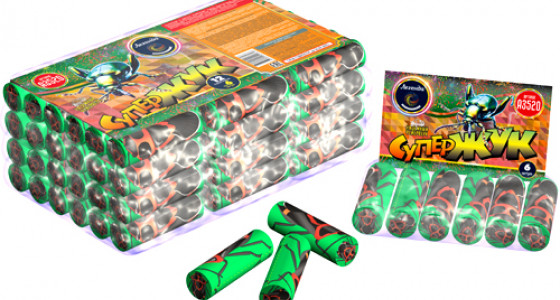 Летающий фейерверк "Супер Жук" - относится к классу напольных подпрыгивающих фейерверков, снаряженных яркими и звукошумовыми пиротехническими эффектами. Эффекты: Вращается, разбрасывая искры. В конце - хлопок.