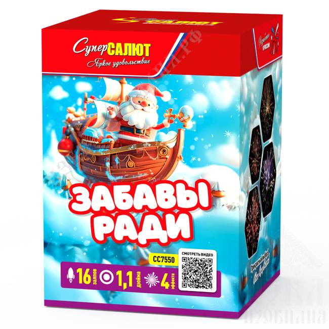 «Забавы ради» — яркое шоу для весёлой компании Праздник, который объединяет Представьте себе ночь, наполненную весельем и яркими красками, где каждый взрыв салюта становится поводом для радости и смеха. Батарея салютов «Забавы ради» — это не просто фейерверк, а настоящий праздник веселья, способный превратить обычный вечер в незабываемое приключение! Четыре акта искромётного шоу Первый акт открывается великолепными парчовыми шлейфами, украшенными мерцающими красными и зелёными звёздами, словно само небо решило поиграть в звёздные прятки. Второй акт представляет собой роскошные золотые волны, усыпанные зелёными и золотыми звёздами, создающие атмосферу настоящего праздника и торжества. Третий эпизод — это трещащие шлейфы с синими и зелёными огоньками, напоминающие весёлый хоровод в ночном небе. Грандиозный финал завершается мерцающими шлейфами с красными огоньками, которые завершают представление на яркой и запоминающейся ноте. Технические особенности 16 мощных залпов создают насыщенное и яркое шоу Калибр 1,1 дюйма — впечатляющая мощь каждого выстрела Высота до 26 метров — захватывающее зрелище для всех зрителей Длительность 20 секунд — динамичное представление 4 уникальных эффекта — каждый момент неповторим Подарите себе и близким вечер, полный веселья и радости с «Забавы ради»! Этот фейерверк не просто украсит небо — он станет центром внимания всей компании, наполнит сердца радостью и подарит незабываемые впечатления. Создайте атмосферу настоящего праздника, где каждый миг наполнен весельем и волшебством. «Забавы ради» — это фейерверк, который объединит друзей и подарит моменты искреннего счастья! Пусть каждый залп станет поводом для смеха и радости, а яркие вспышки создадут настроение настоящего торжества!